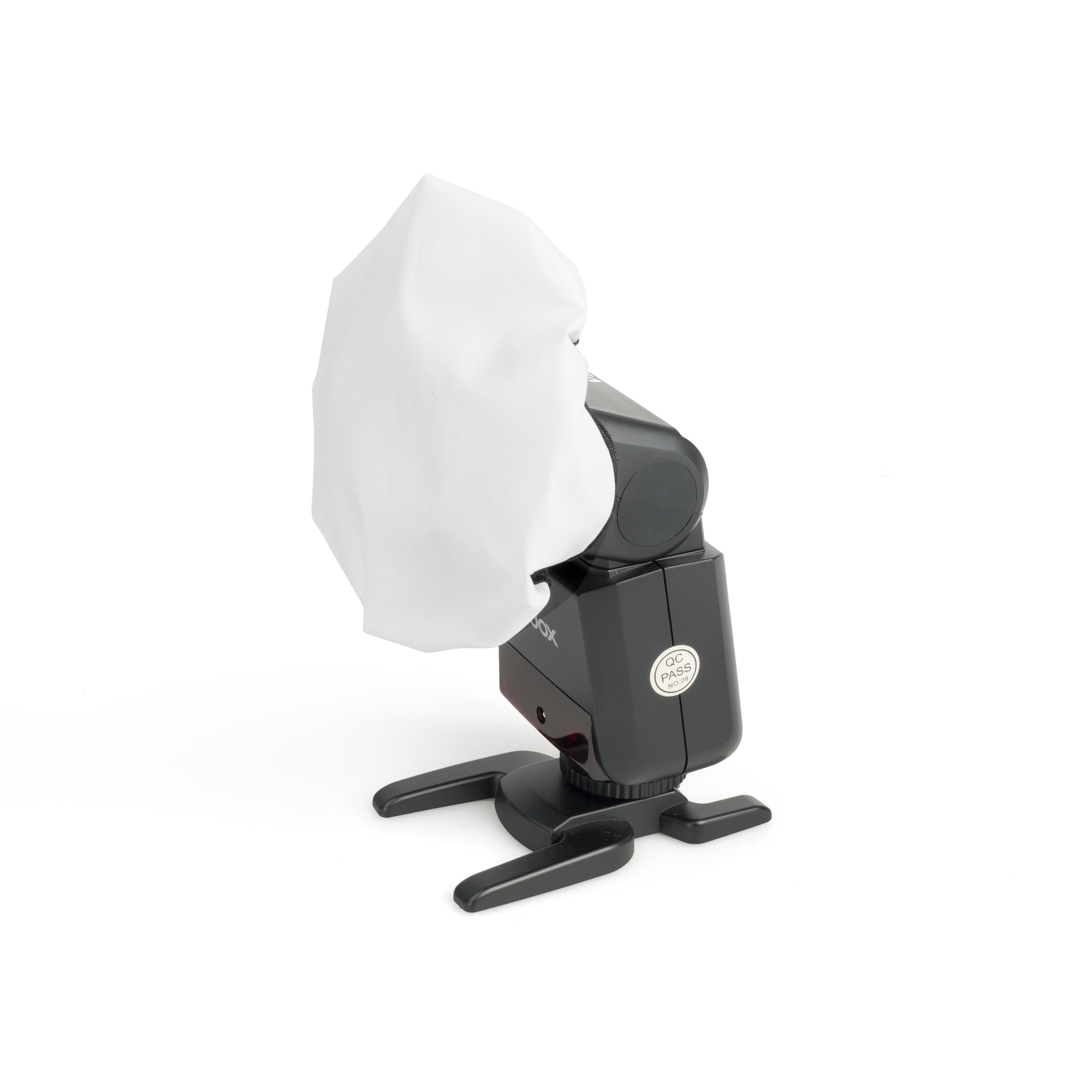 生地はポリエステルの白布製。機材への取り付けはディフューザー開口部のゴムを広げてストロボ発光部、リフレクター前面に被せるだけ。簡単にご使用いただけます。