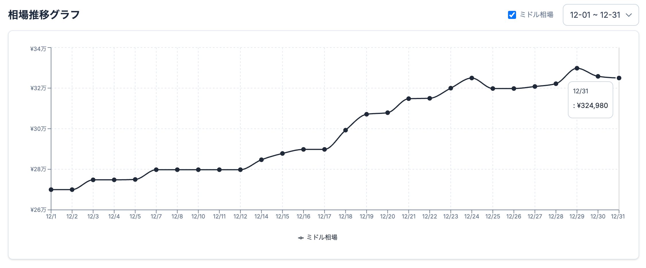 ※本データは、各時点で在庫のあるBTOパソコンを対象に算出しています。そのため、特定メーカーで在庫切れや販売停止が発生した場合、一時的に相場価格が大きく変動して見えることがあります。あくまでも参考値としてご覧ください。