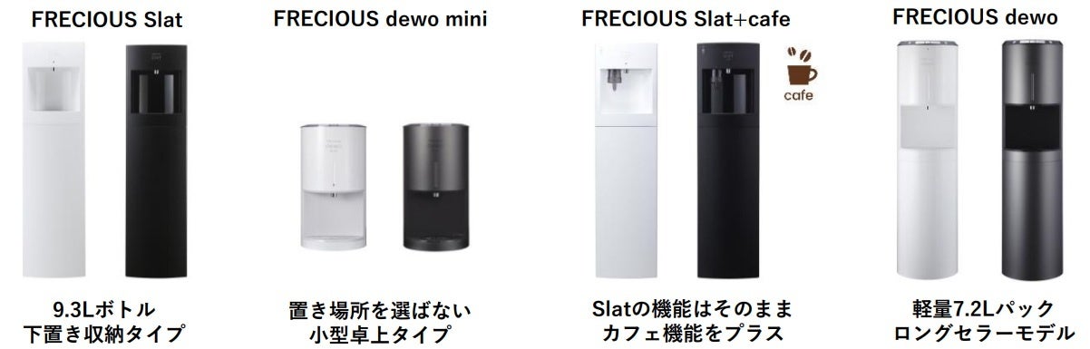「FRECIOUS」シリーズは、安心・安全の高品質な天然水を、採水地よりご自宅へ直送する宅配型のウォーターサーバーブランドです。富士山の開発限界区域である標高約1,000m地点の地下から採水したナチュラルミネラルウォーターを使用しています。日本の住環境に馴染むデザインと高い機能性を追求した、使い心地のよいウォーターサーバーを展開しており、お子様がいるご家庭でも安心してお使いいただけます。