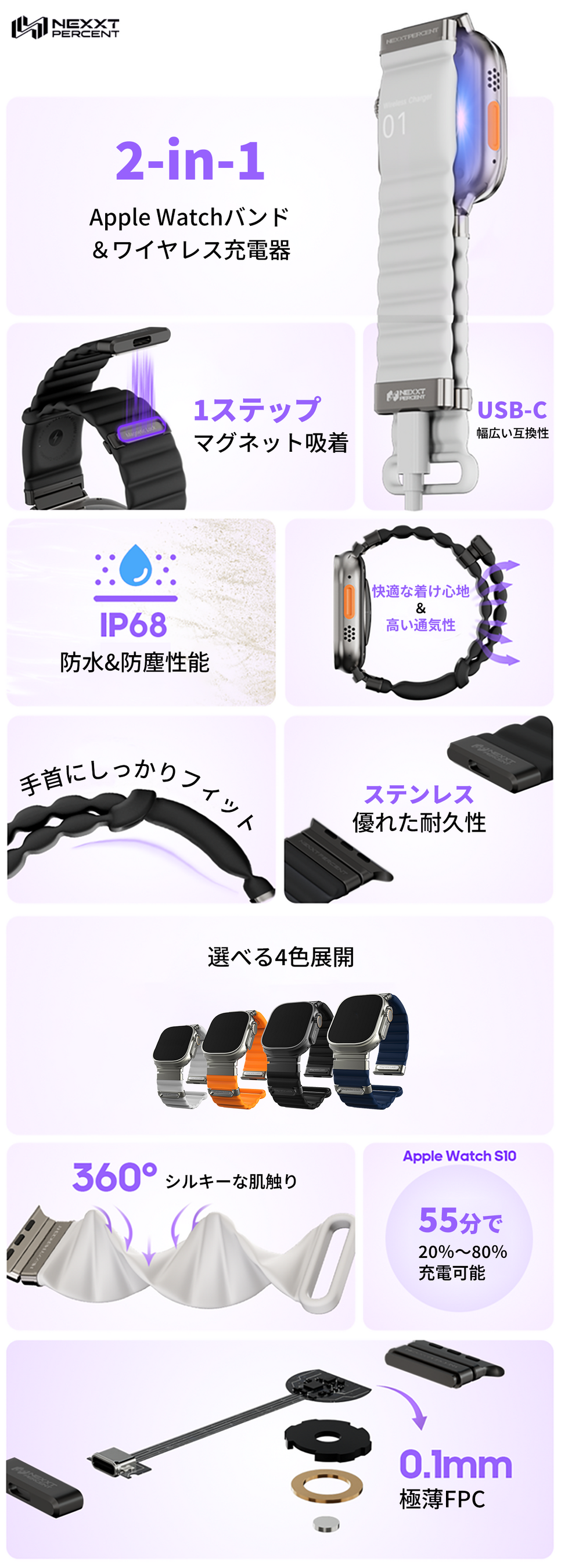 「NEXXT PERCENT Pro」(ネクストパーセントプロ)は、“Apple Watchを充電するには専用充電器が必要”という従来の常識を覆し、充電スタイルを一新してくれる次世代Apple Watch特化型充電バンド。