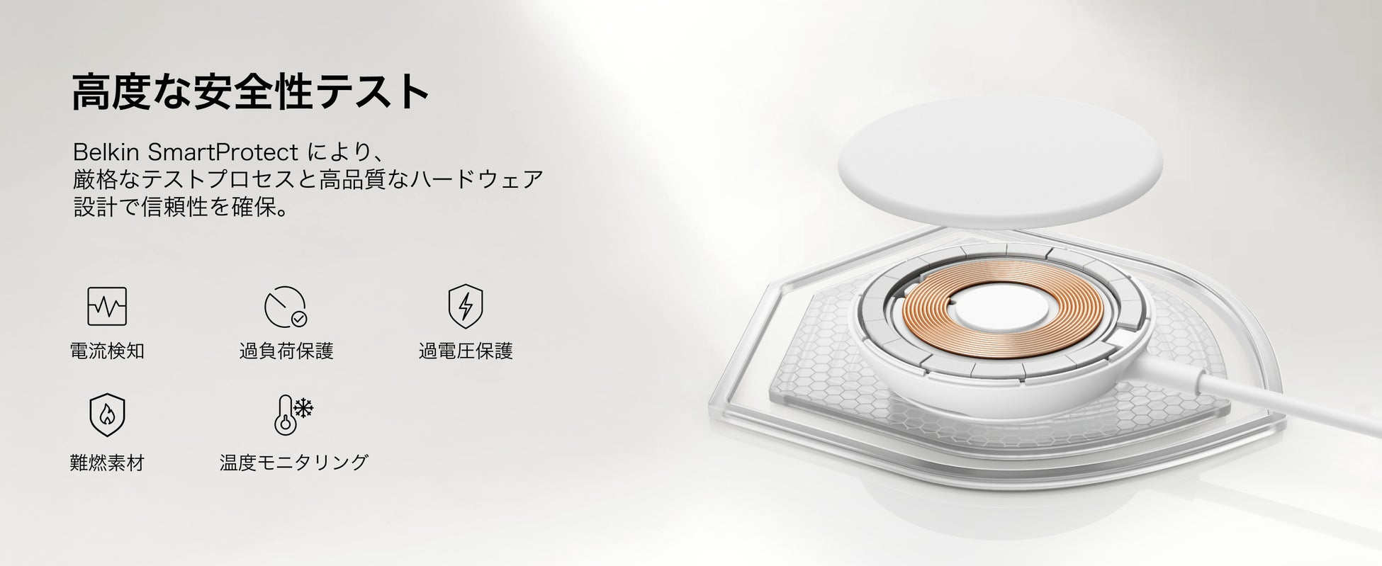 Belkin SmartProtect: 高度なインテリジェント温度制御技術と異物検知機能を搭載。デバイスの安全を第一に考えた保護設計により、安心して急速充電を行えます。