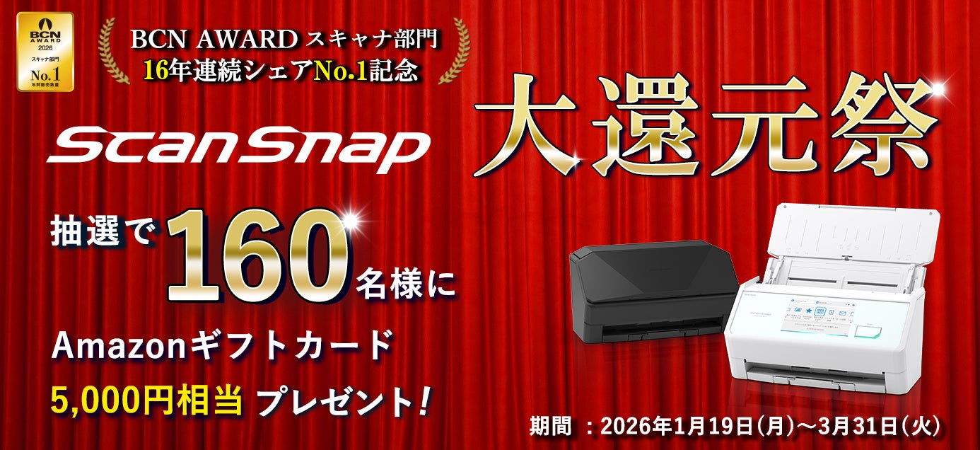製品ご愛顧の感謝として、「BCN AWARD 16年連続シェアNo.1記念 ScanSnap 大還元祭」を、2026年1月19日より開催します。