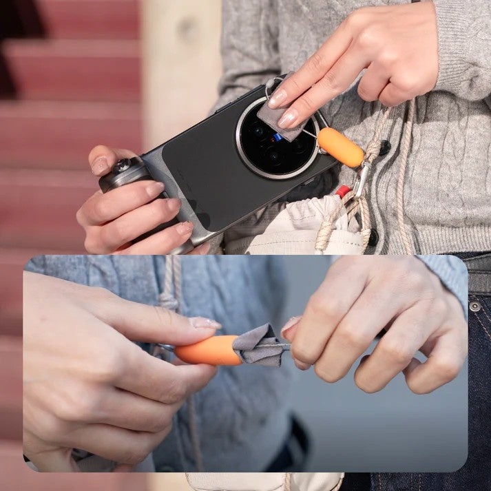 ショルダーストラップに内蔵のクリーニングクロスで、レンズや画面を手軽に拭けます。