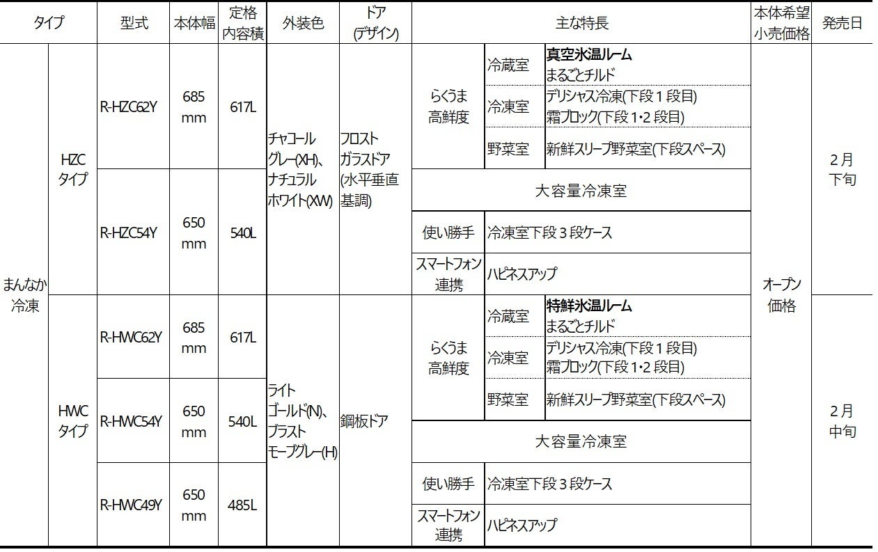 また、コネクテッド家電の「まんなか冷凍 HWCタイプ」3機種(「ハピネスアップ」連携、「特鮮氷温ルーム」採用、外装色ライトゴールド・ブラストモーブグレー、鋼板ドア、定格内容積617L・540L・485L)を2月中旬から発売します。