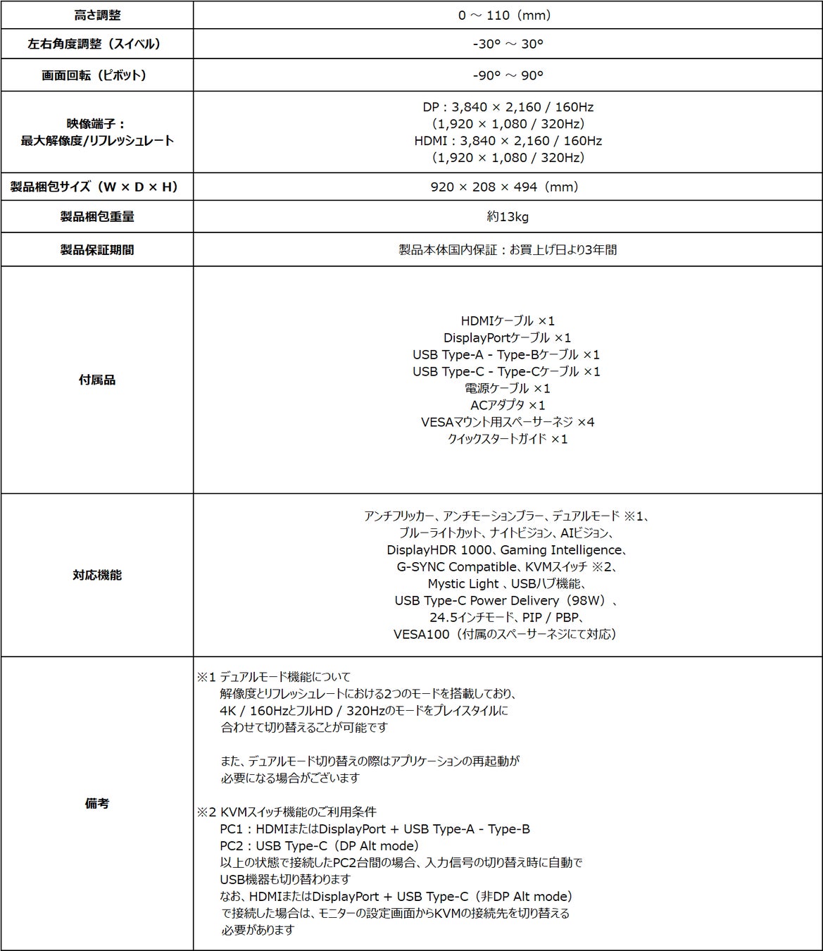 4K UHD(160Hz)とフルHD(320Hz)の2つのモードを簡単に切り替え可能
