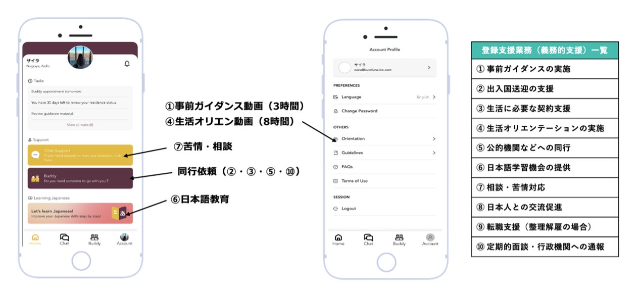 KUROFUNEは現在2つのアプリを運用しています。在日外国人に対して、日本での就職活動を支援するアプリ「KUROFUNE」と、2019年4月から運用が始まった特定技能労働者の法的支援と定着支援をアプリ上で行う「KUROFUNE PASSPORT」です。