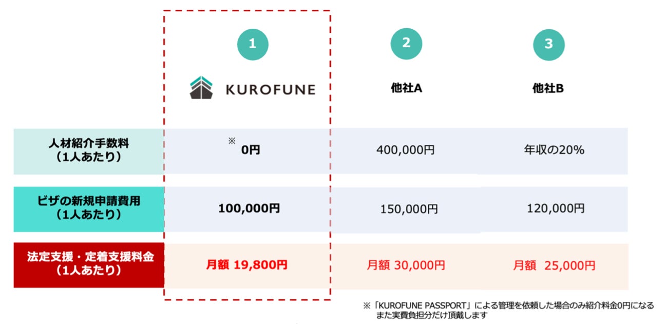 2019年に新設された「特定技能」は、1日に約380人が増加する(2025年4月〜2025年6月の3ヶ月間の平均:出入国在留管理庁 外国人材の受入れ及び共生社会実現に向けた取組を参照)ほど人気の在留資格です。しかし転職が可能であるために、なかなか自社内に定着できないといった課題を抱えている企業が多くあります。既存の人材紹介業界のモデルであると、人材紹介手数料が主な収入益となっているため、「特定技能」労働者の定着支援まで行うことができないと考え、「外国人の採用市場の常識を変える」ために、法定支援・定着支援を行う「KUROFUNE PASSPORT」アプリを自社開発し、業界では考えられなかった新しい料金体系でサービスを提供しています。