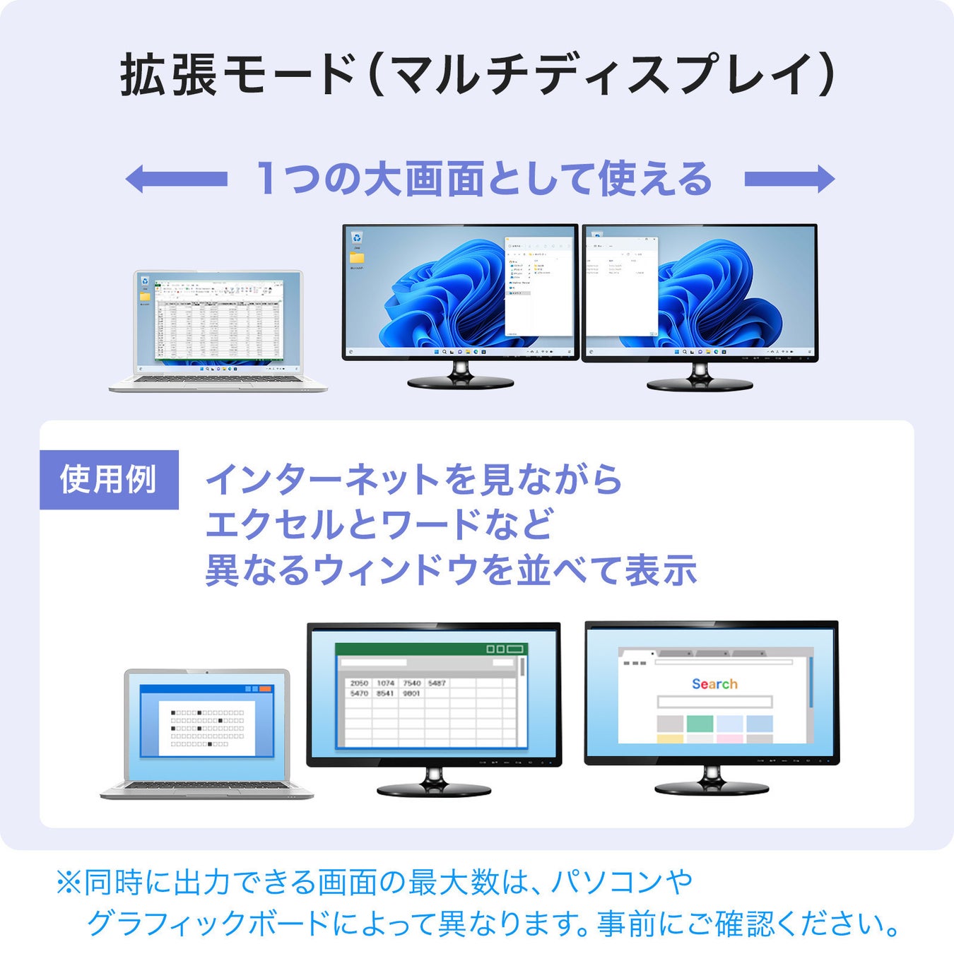 ノートパソコンの画面を含めた場合、Windowsパソコンの画面を最大3画面に拡張でき、4K/60Hz出力にも対応しています。また、最大100WまでのPD給電に対応しており、映像出力を行いながらパソコン本体への充電も可能です。
