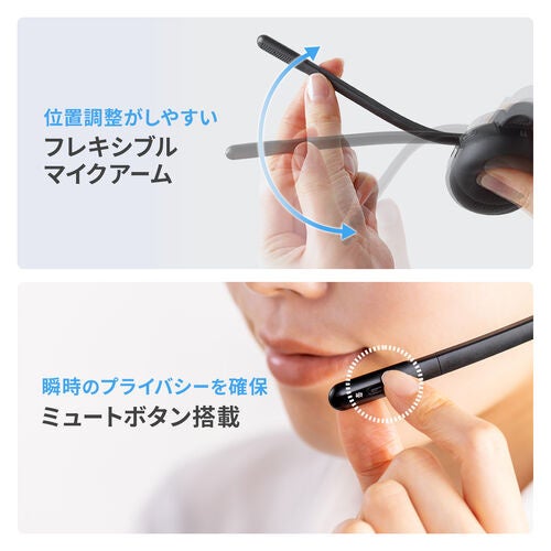 マイク部にはワンタッチで操作できるミュートボタンを搭載。とっさに音声をオフにしたい場面でも、スムーズに対応できます。マイクは回転式かつフレキシブル構造で、左右どちらの耳にも対応し、最適な位置に調整可能です。