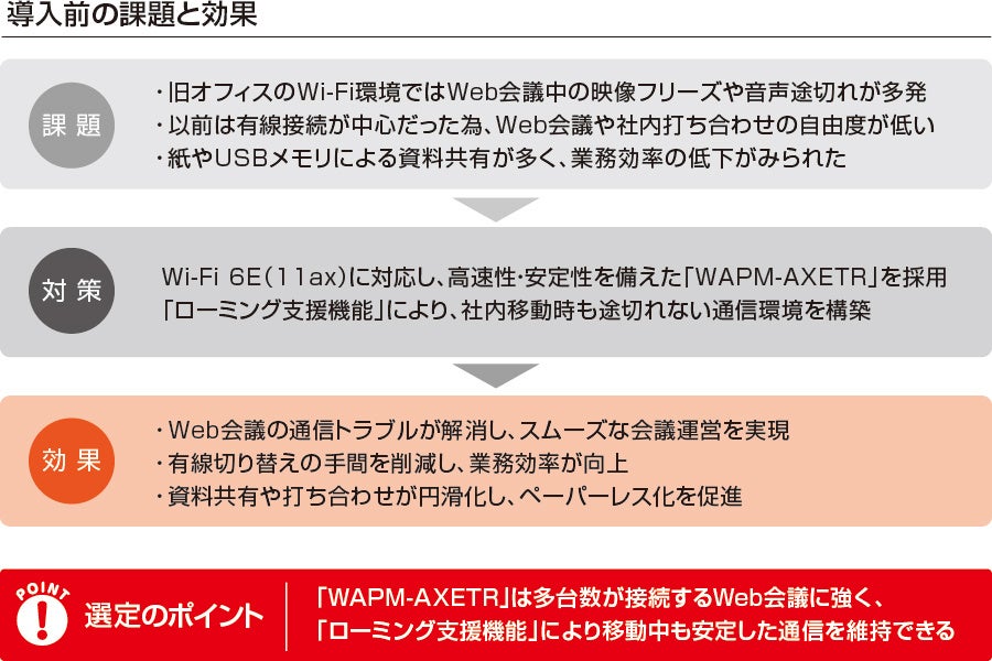 Wi-Fi 6E(11ax)対応機器とマルチギガスイッチで新オフィス全体を高速化。「ローミング支援機能」で移動時も安定してつながるWi-Fi環境に。