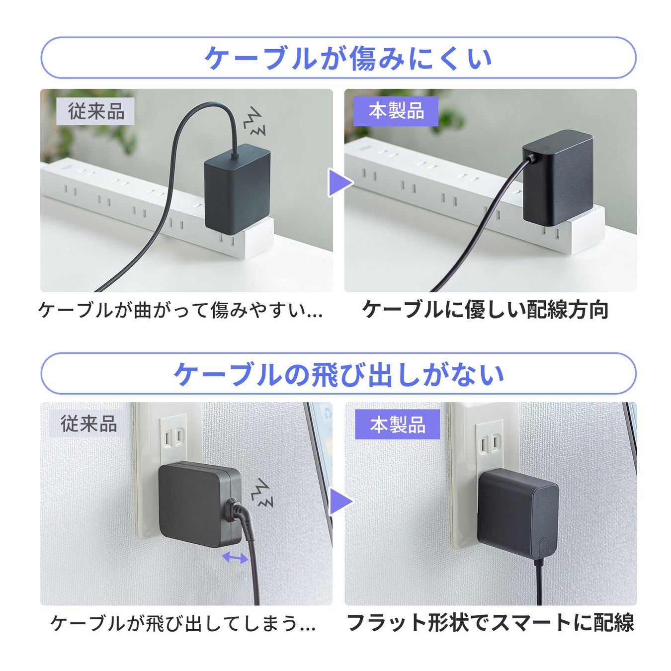 本体からケーブルの飛び出しを抑えた構造なので、ケーブルの付け根に負担がかからず、スマートに配線できます。