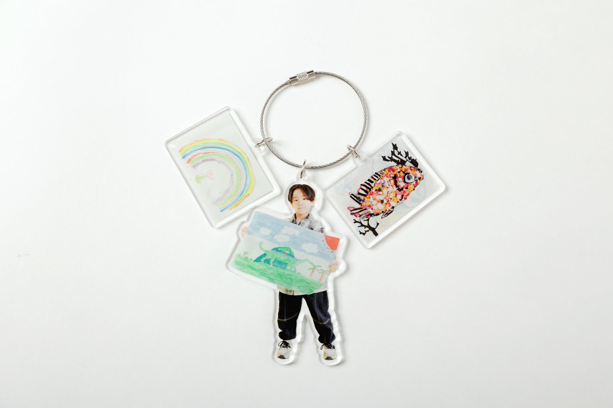 お子様と作品の撮影に加え、作品単体の撮影も行い、完成した写真は「デザイン台紙」「ワイヤーアクリルキーホルダー」に仕上げてお渡しします。進級・進学の記念としてはもちろん、何気ない一年間の成長を“作品”という視点から振り返ることができる点が特長です。完成したキーホルダーは、お子様のランドセルに付けたり、祖父母へのプレゼントとしても活用でき、思い出を日常の中で楽しめる形で残すことができます。