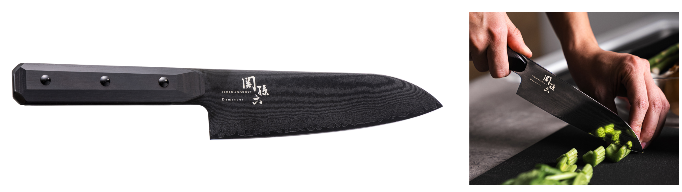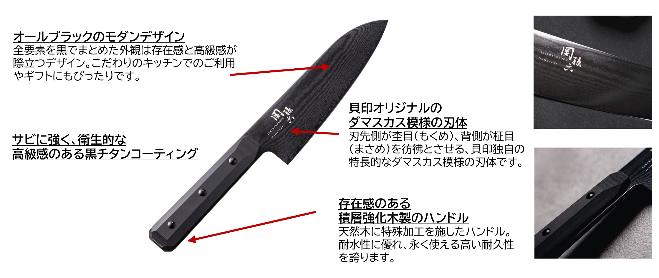 今回新しく登場した「関孫六 ダマスカス ブラック」は、「ダマスカス」の本体構造をベースに、刃体に黒チタンコーティングを施すことでよりサビに強く、ハンドルは存在感のあるこだわりのデザインを採用。衛生的で高級感あふれる商品となっています。黒でまとめたモダンな外見は、近年人気な黒基調のキッチンや家電との一体感も抜群であり、男性のご利用やギフトにもぴったりです。