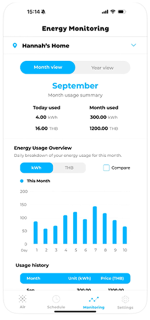 また、電力使用量のモニタリング機能を搭載し、あらかじめ設定した使用料金の目安に応じて消費電力を自動的に抑制します。これにより、「エアコンは電気代がかかる」という不安を軽減し、無理なく節電を続けられる環境を提供します。