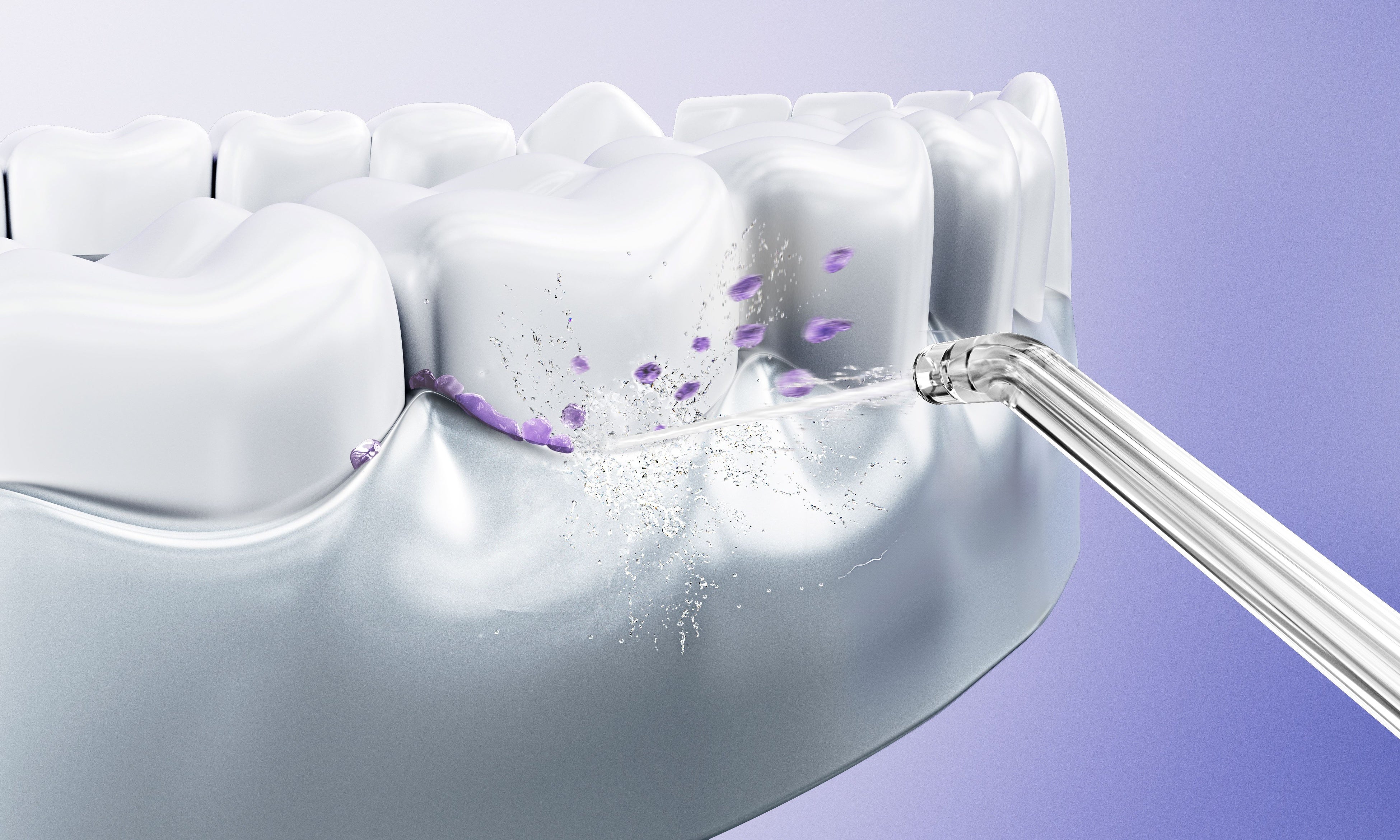 微細なウルトラファインバブルが汚れに吸着して剥がし落とすことで、水流の力のみ(ウルトラファインバブルなし)の場合と比べて歯垢除去率が約359%アップ*。歯列矯正の器具周りのケアにもおすすめです。