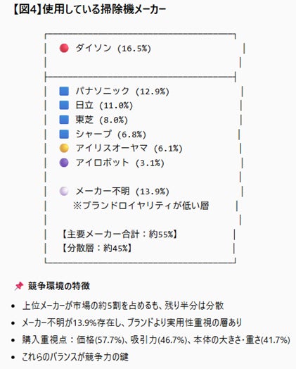 AI分析ツール「CotoEL」が調査データをもとに掃除機市場の現状を分析、その結果を各項目300字程度に要約した本文です。生活者の利用実態や選択基準、主要ブランドを整理することで、新規参入時の戦略立案に活用できる示唆が得られています。