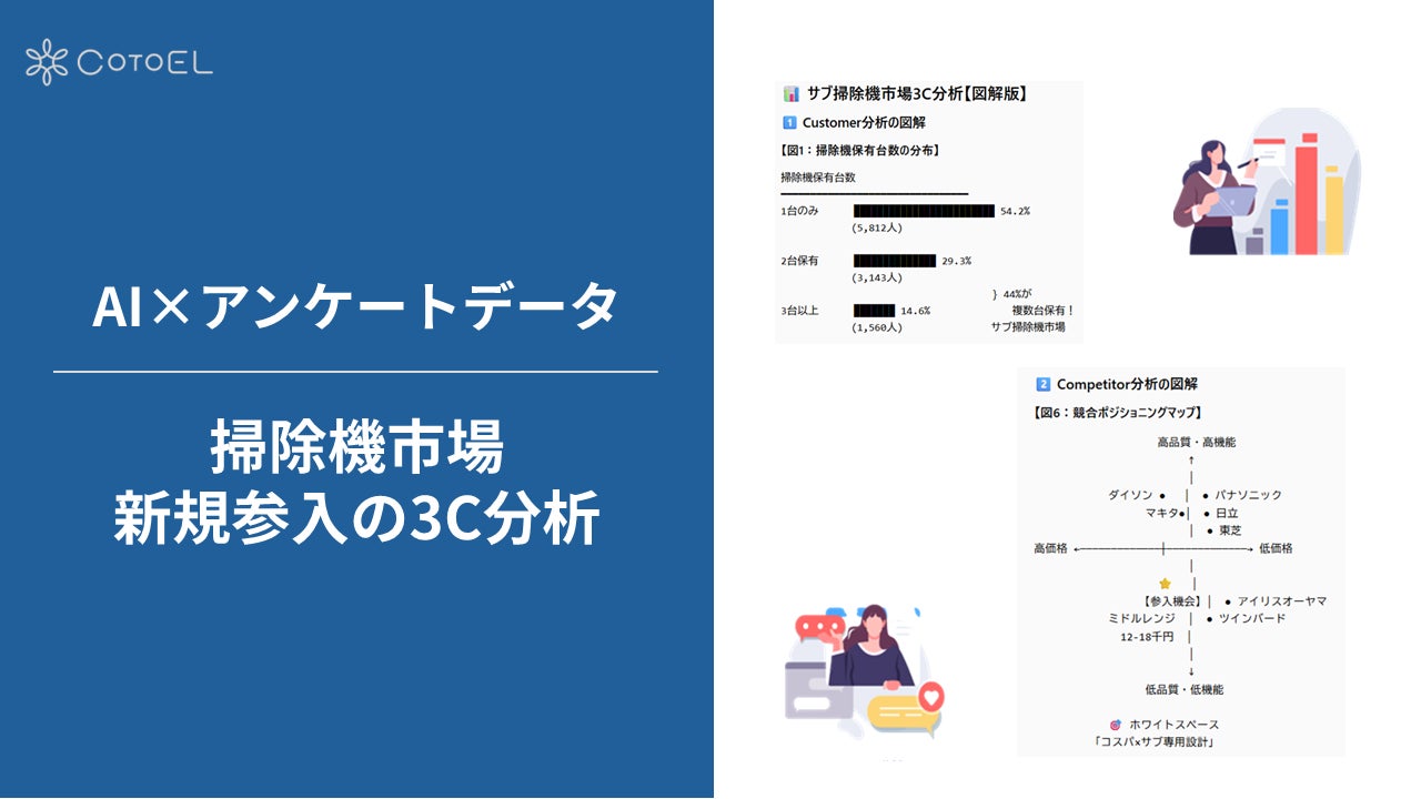 AI分析ツール「CotoEL(コトエル)」に上記アンケートデータを設定し、掃除機市場に新規参入する際の3C分析を行いました。