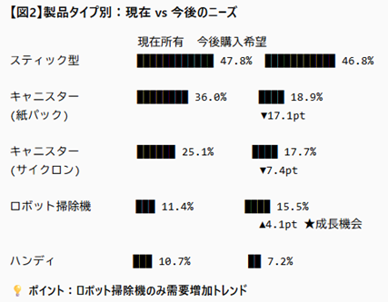 AI分析ツール「CotoEL」が調査データをもとに掃除機市場の現状を分析、その結果を各項目300字程度に要約した本文です。生活者の利用実態や選択基準、主要ブランドを整理することで、新規参入時の戦略立案に活用できる示唆が得られています。