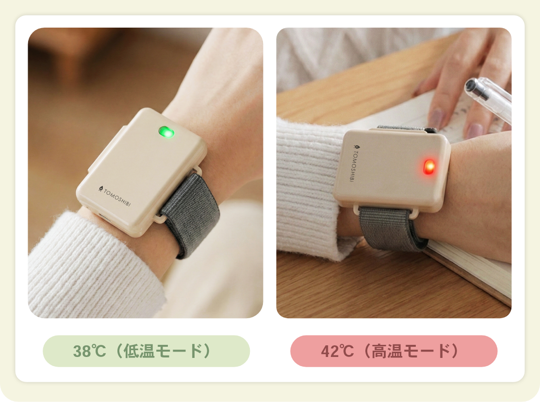 一般的な電気カイロの中には50℃を超えるものもありますが、TOMOSHIBIは「ずっと着けていられること」を最優先し、体温に近い38℃(低モード)と、お風呂のような心地よさの42℃(高モード)の2段階に設定。