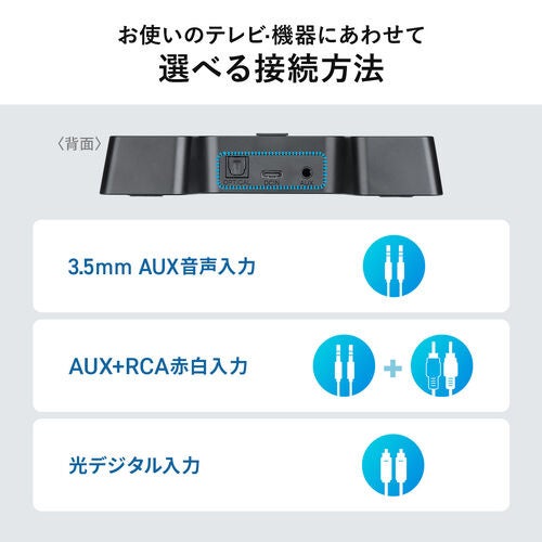 3.5mm、光デジタル、RCA赤白端子に対応し、新旧さまざまなテレビや音響機器で使用可能。付属ケーブルも充実しているため、買ってすぐに使い始められます。リビングはもちろん、離れた場所での“ながら聴き”にも活躍します。