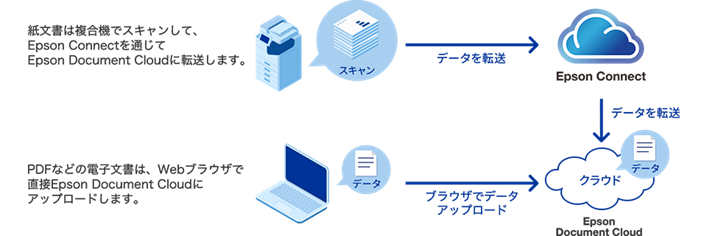 ・紙の文書はエプソンの複合機でスキャンし、「Epson Connect」(注3)経由で直接クラウドにアップロードが可能です。