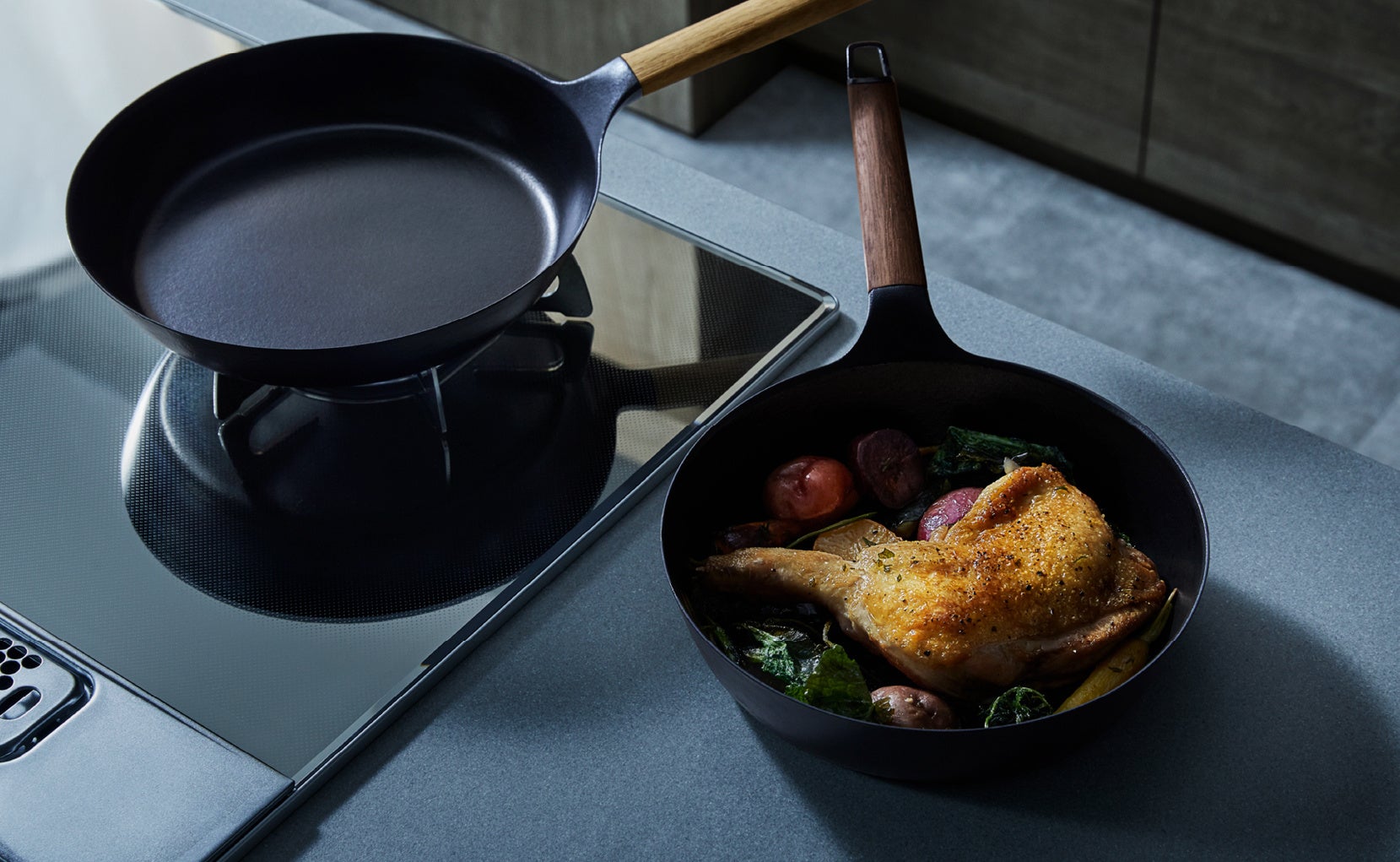 「世界一、素材本来の旨みを凝縮するフライパン」を目指し開発。新開発のホーローと蓄熱性の高い鋳鉄を組み合わせることで、食材の余分な水分を瞬間的に蒸発させ旨みを凝縮。シンプルな火入れで、いつもの手料理がまるで生まれ変わったように美味しくなります。女性でも扱いやすい薄さと軽さを実現しました。