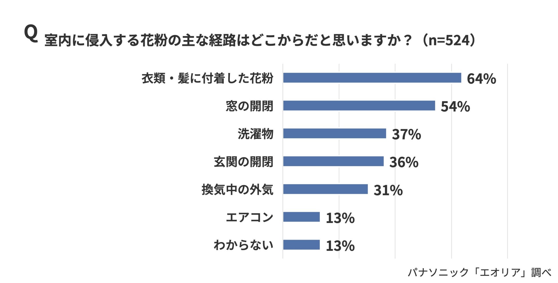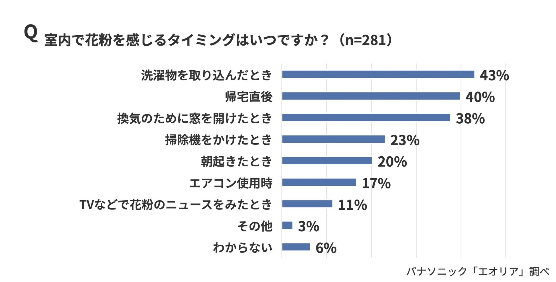 最も多かったのは「洗濯物を取り込んだとき」(43%)で、次いで「帰宅直後」(40%)、「換気のために窓を開けたとき」(38%)が続きました。衣類や洗濯物、換気などを通じて、日常動作の中で花粉が室内に持ち込まれている様子がうかがえます。