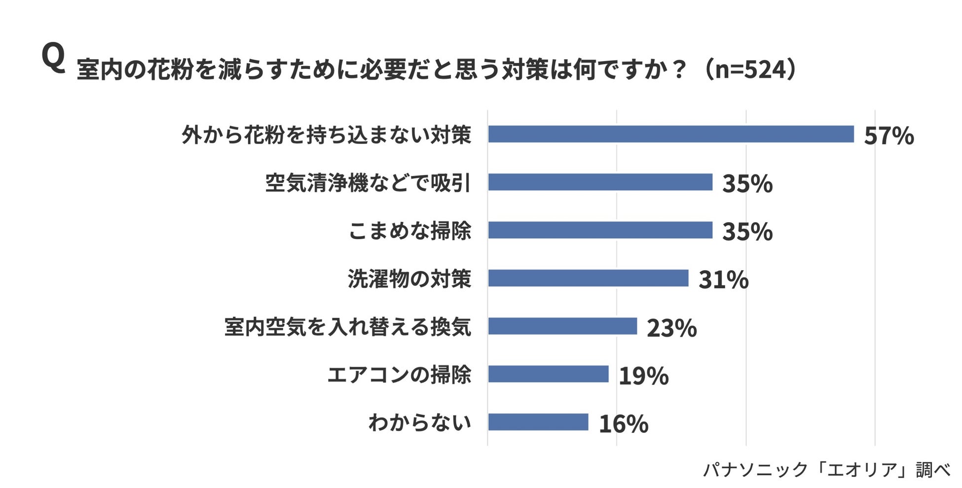 では、室内の花粉を減らすために必要だと思う対策は何でしょうか。「外から花粉を持ち込まない対策」(57%)が最も多く、「空気清浄機などで吸引」(35%)、「こまめな掃除」(35%)、「洗濯物の対策」(31%)が続きました。“持ち込まない・ためない・取り除く”という複数の対策を組み合わせる必要があると考えている人が多いことがわかります。