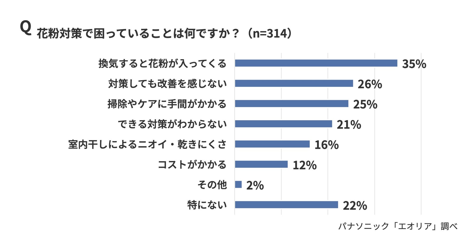 花粉対策で困っていることとしては、「換気すると花粉が入ってくる」(35%)が最多で、「対策しても改善を感じない」(26%)、「掃除やケアに手間がかかる」(25%)、「できる対策がわからない」(21%)と続きました。「対策したいが、どうすればいいのかわからない」「やっても効果を実感しにくい」というジレンマが見えてきます。