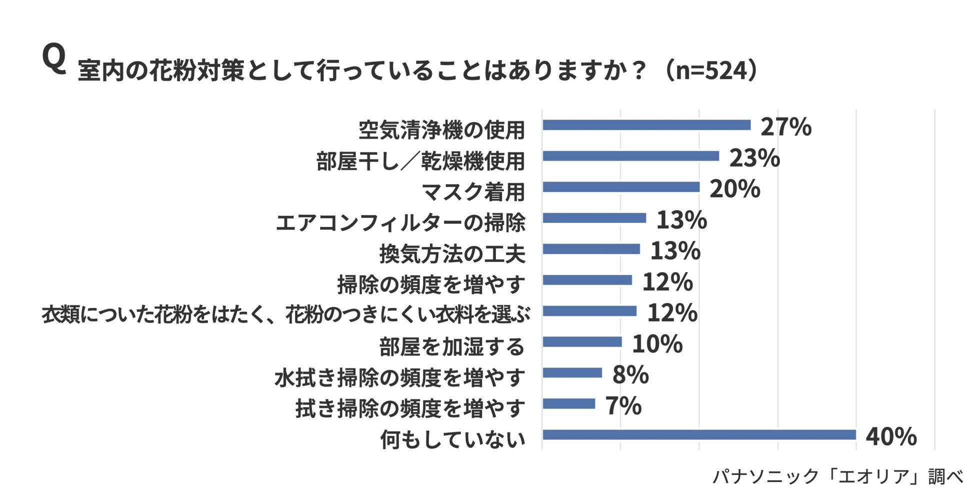 実際に行っている室内の花粉対策を見ると、「空気清浄機の使用」(27%)、「部屋干し/乾燥機使用」(23%)、「マスク着用」(20%)などが上位となりました。一方で、「何もしていない」と答えた人も40%にのぼり、対策の必要性を感じつつも行動に移せていない層が多いことがわかります。