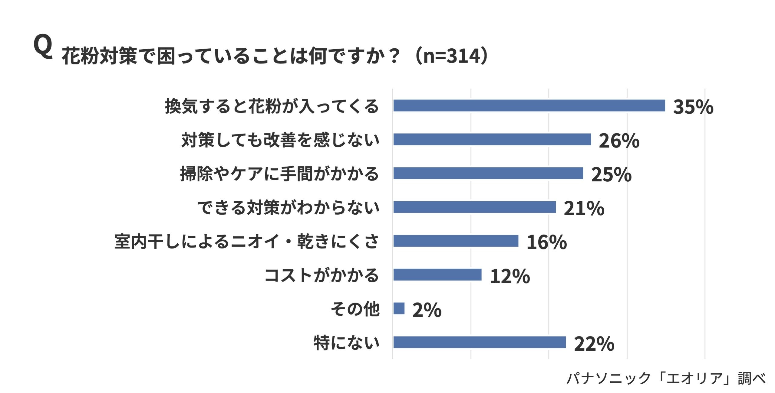 では、室内の花粉を減らすために必要だと思う対策は何でしょうか。「外から花粉を持ち込まない対策」(57%)が最も多く、「空気清浄機などで吸引」(35%)、「こまめな掃除」(35%)、「洗濯物の対策」(31%)が続きました。“持ち込まない・ためない・取り除く”という複数の対策を組み合わせる必要があると考えている人が多いことがわかります。