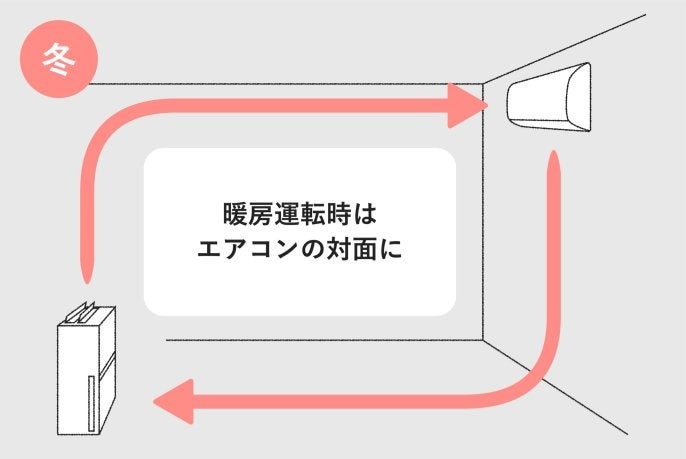 エアコンの暖房は足元から暖めるのがオススメのため、下向きの気流となります。対面に空気清浄機を置くことで、汚れた空気を空気清浄機の方へ送り込みフィルタ―を通じて上部から空気を吹き出すことで、効率的にお部屋の空気を循環しながら清浄することができます。
