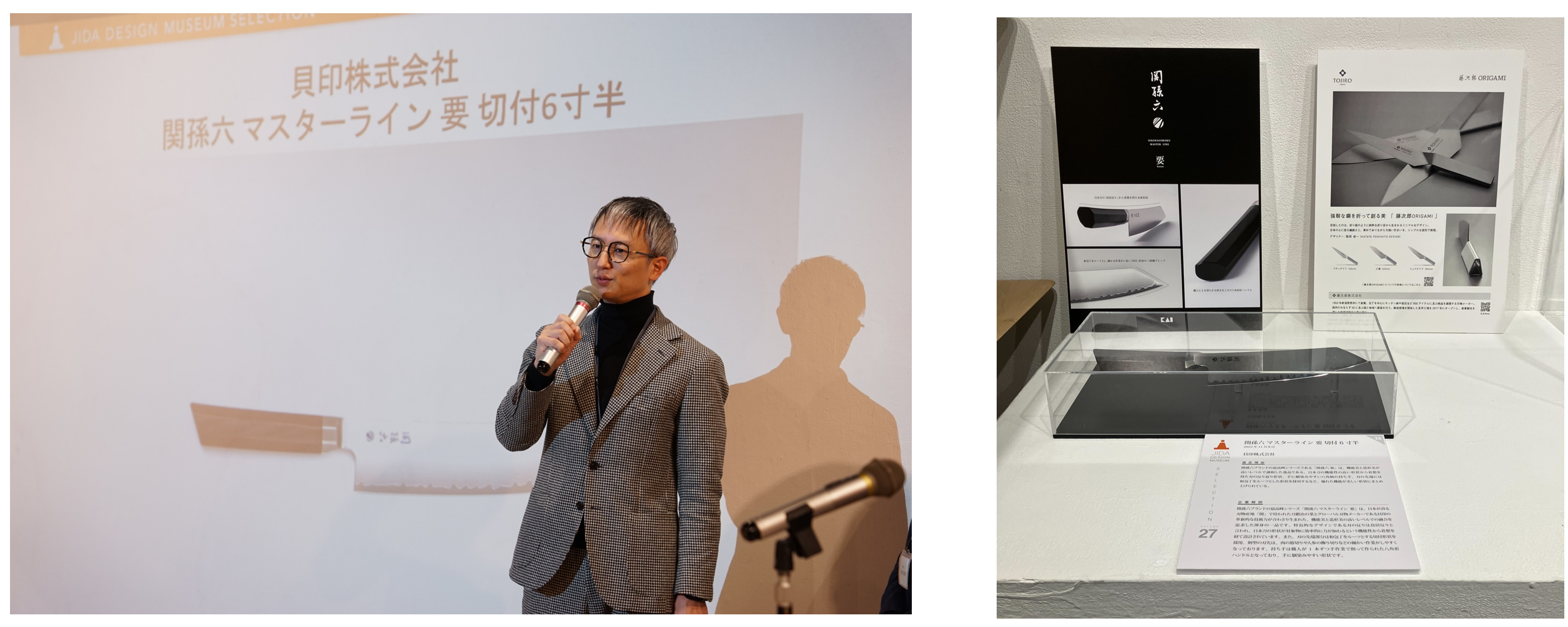 関孫六は関の孫六という刀匠を冠したブランドですが、日本刀や日本の文化、歴史といったものをルーツにしながらデザインしていくことは自然なことでした。いろいろと形状を検討していく中で、背側にハンドルからブレードにかけて反った形というのは食材に対して一番効率的に作用します。この反りは鳥居反りといって、3種の神器の1つに日本刀が数えられているように、その精神性や伝統、技術・機能的なものも含めてそういった意味をこの反りという形に統合させたというデザインになっております。海外にこういった日本製の包丁を持ってく機会も多くありますが、我々が何者であるのか、どういう文化の背景があるかとか、そういったものがよりこう近年においては重要になっているのかなと考えております。今回このような賞をいただき光栄です。ありがとうございました。
