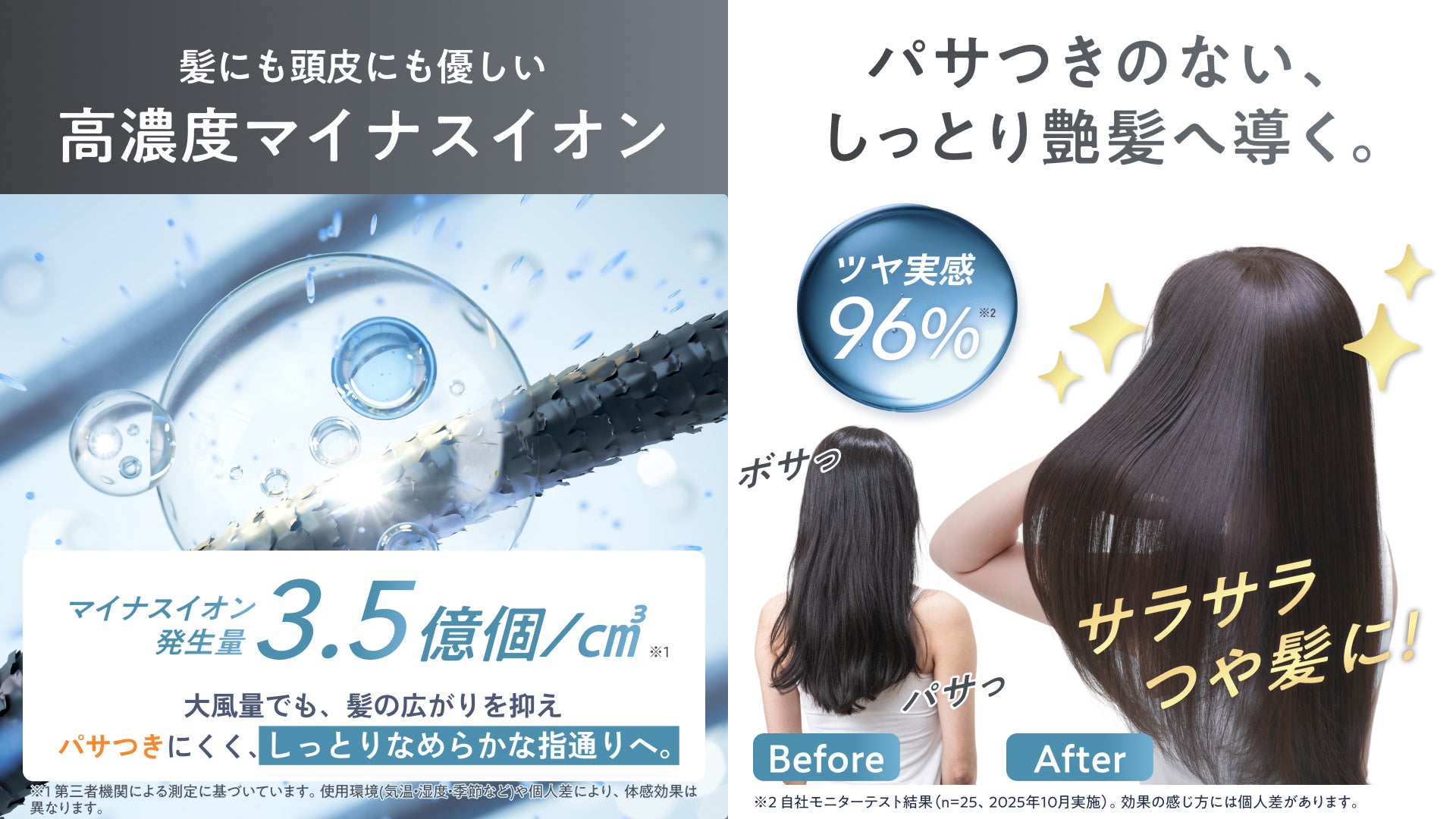 【高濃度マイナスイオンで、風量が強くても美髪】
