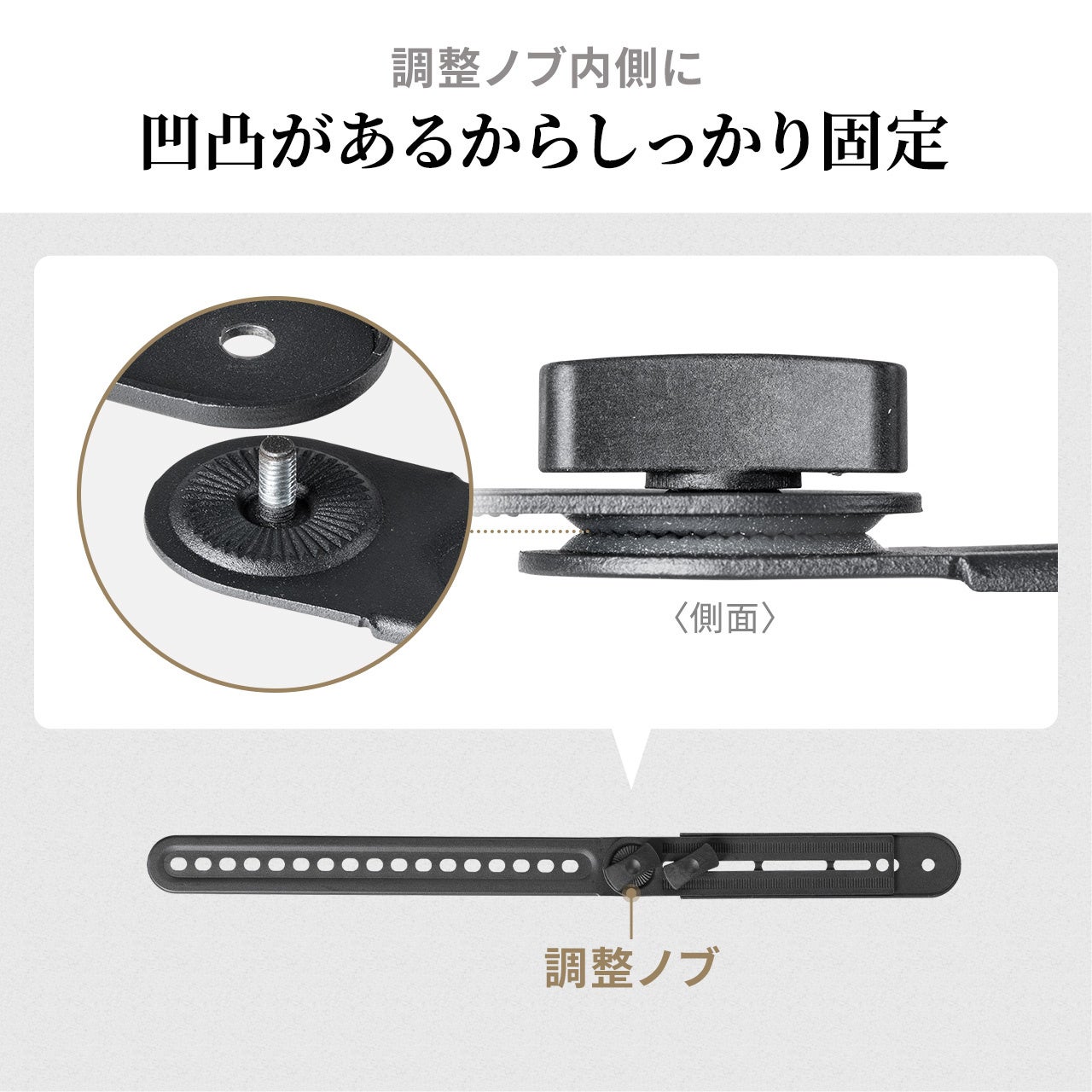 サウンドバーの固定は「背面ボルト穴」「背面キーホール」「底面ボルト穴」に対応。さらに固定穴がない機種でも、付属のL字ブラケットに載せて設置できます。機種ごとに異なりがちな取り付け仕様に柔軟に対応し、買い替えや機器追加の際も“使い続けやすい”汎用性を追求しました。