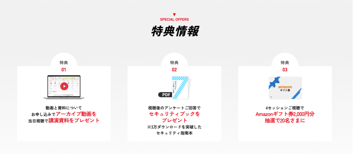 お申し込みいただいたすべての方は、後日アーカイブ動画をご視聴いただけるほか、当日ご視聴いただいた方には講演資料をご提供します。さらに、視聴後のアンケートにご回答いただくと累計3万ダウンロードを突破したセキュリティ指南本『セキュリティ 7つの習慣・20の事例』のPDFデータをお渡しします。