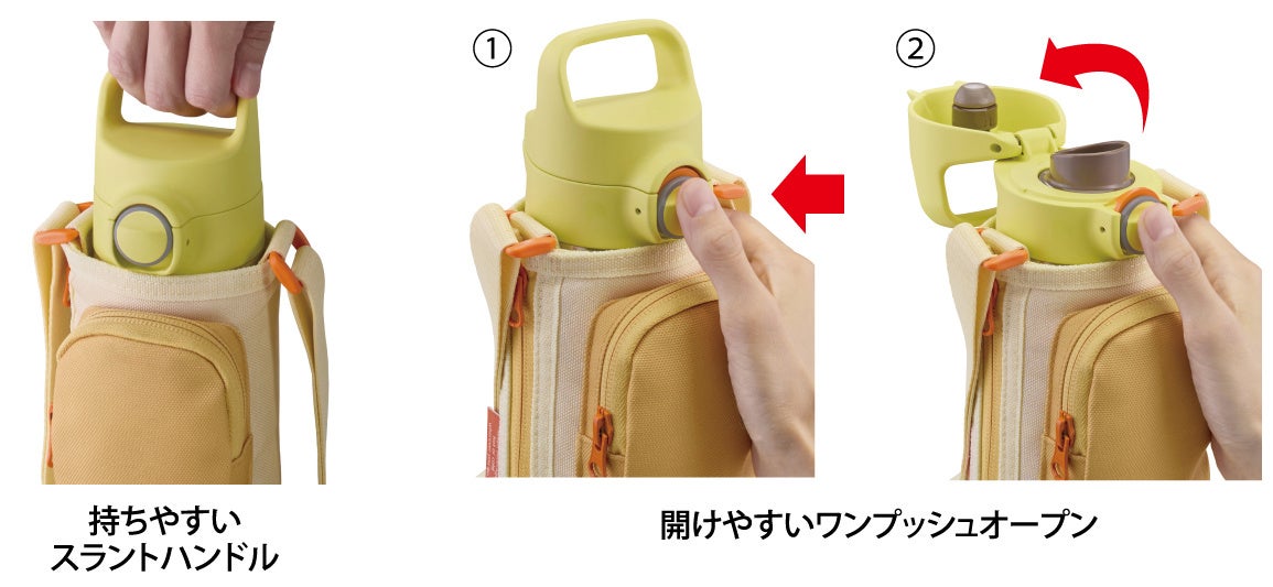 ハンドルは持ちやすく、お出かけ時に便利。ふたは、ワンプッシュで簡単にオープンするので、片手で操作して、すばやく水分補給することができます。
