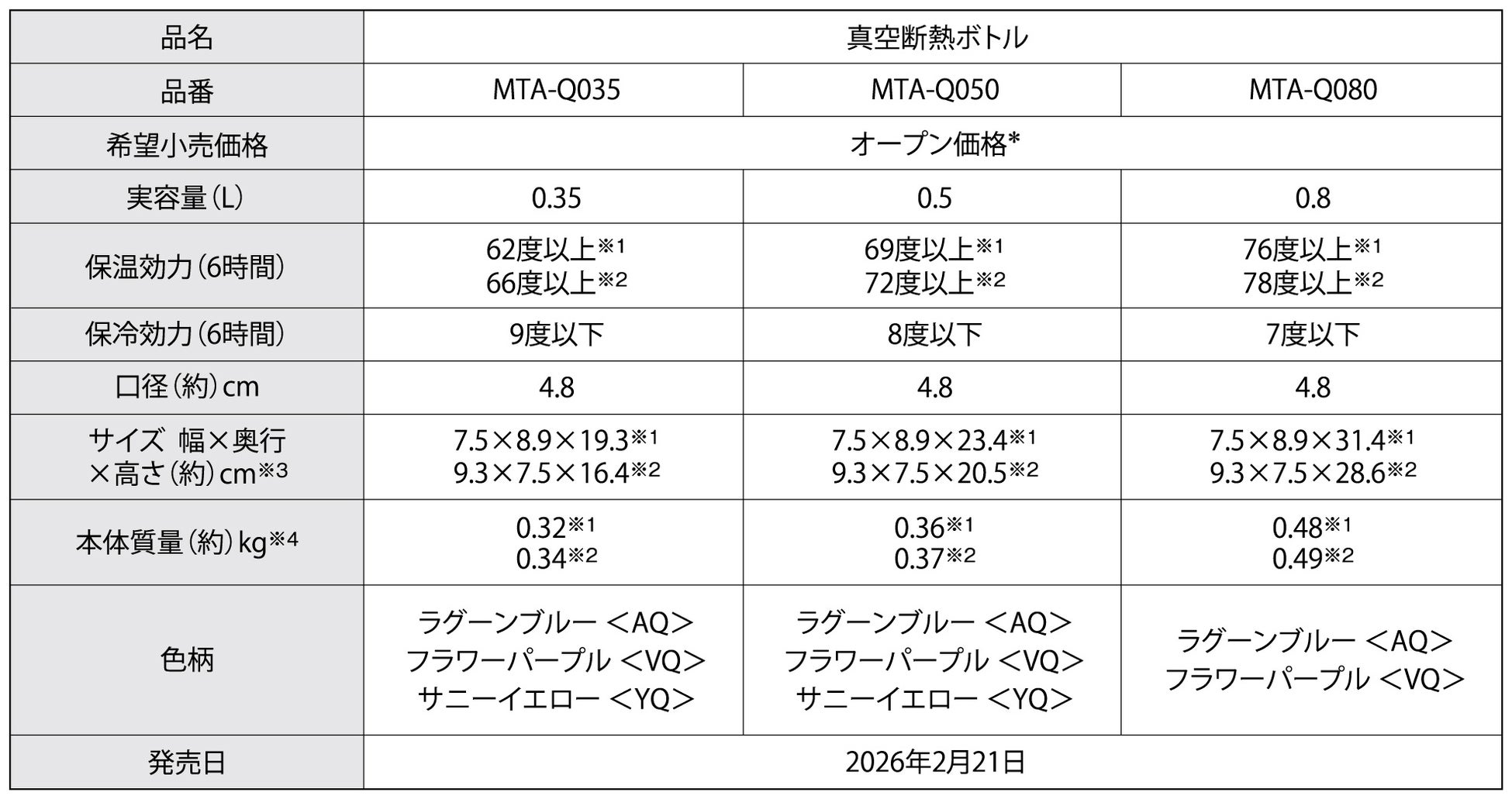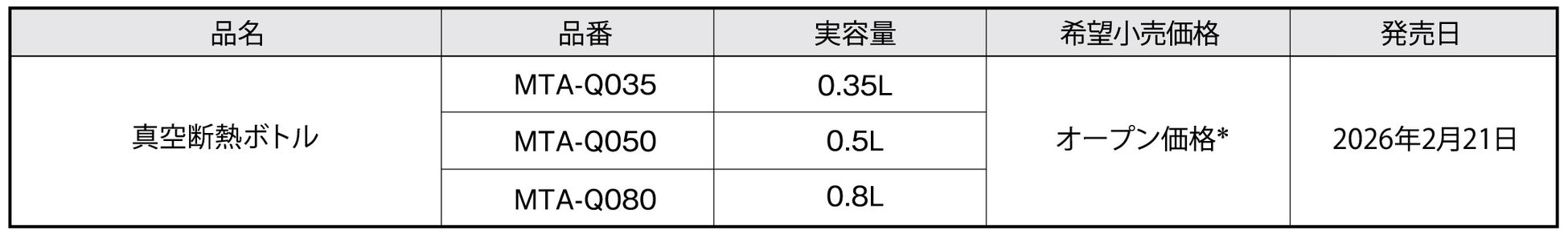 熱制御テクノロジーで世界をリードするタイガー魔法瓶株式会社(社長:菊池嘉聡、本社:大阪府門真市)は、「真空断熱ボトルMTA-Q035/Q050/Q080」を2026年2月21日(土)に発売いたします。