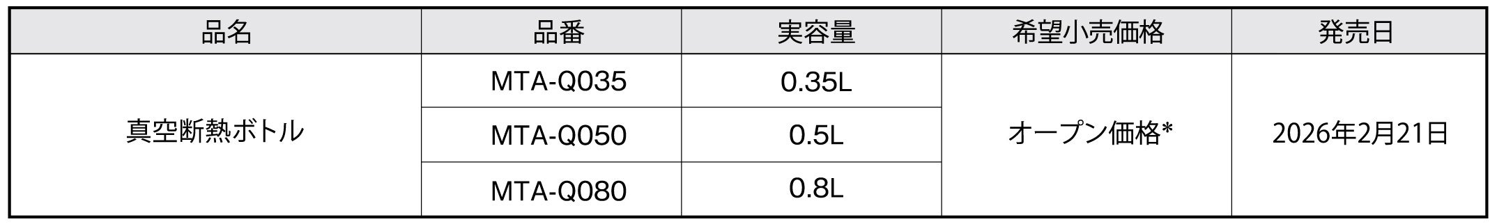 熱制御テクノロジーで世界をリードするタイガー魔法瓶株式会社(社長:菊池嘉聡、本社:大阪府門真市)は、「真空断熱ボトルMTA-Q035/Q050/Q080」を2026年2月21日(土)に発売いたします。