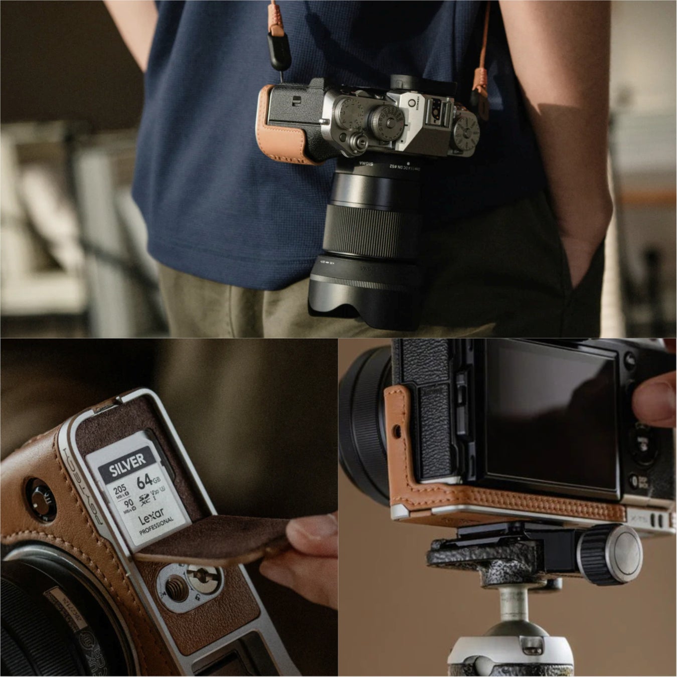上質なイタリア・MASTROTTO(マストロット)社製レザーを採用し、カメラ形状に沿うフィット感と、日常の持ち運びでも安心できる保護性能を両立。1/4-20ネジ穴やSDカードスロットを備え、三脚撮影やアクセサリー装着にも対応します。クラシックなボディデザインに馴染むレザーの質感と、操作性を損なわない専用設計で、カメラを相棒として持ち歩く日常に自然と溶け込みます。