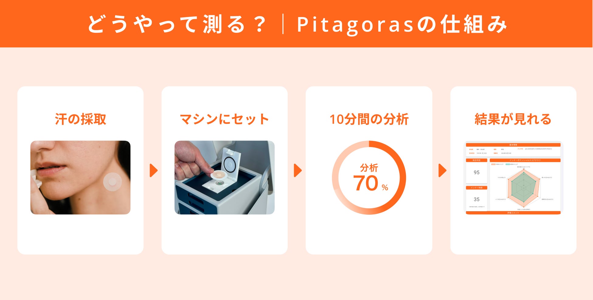 「Pitagoras」は(株)PITTANが開発した小型の体液(主に汗)分析マシンであり、従来の大がかりな 装置や専門的知識が必要だった体液分析を、誰でも簡単・迅速に、わずか10分程度で分析結果がでる、革新的なデバイスです。