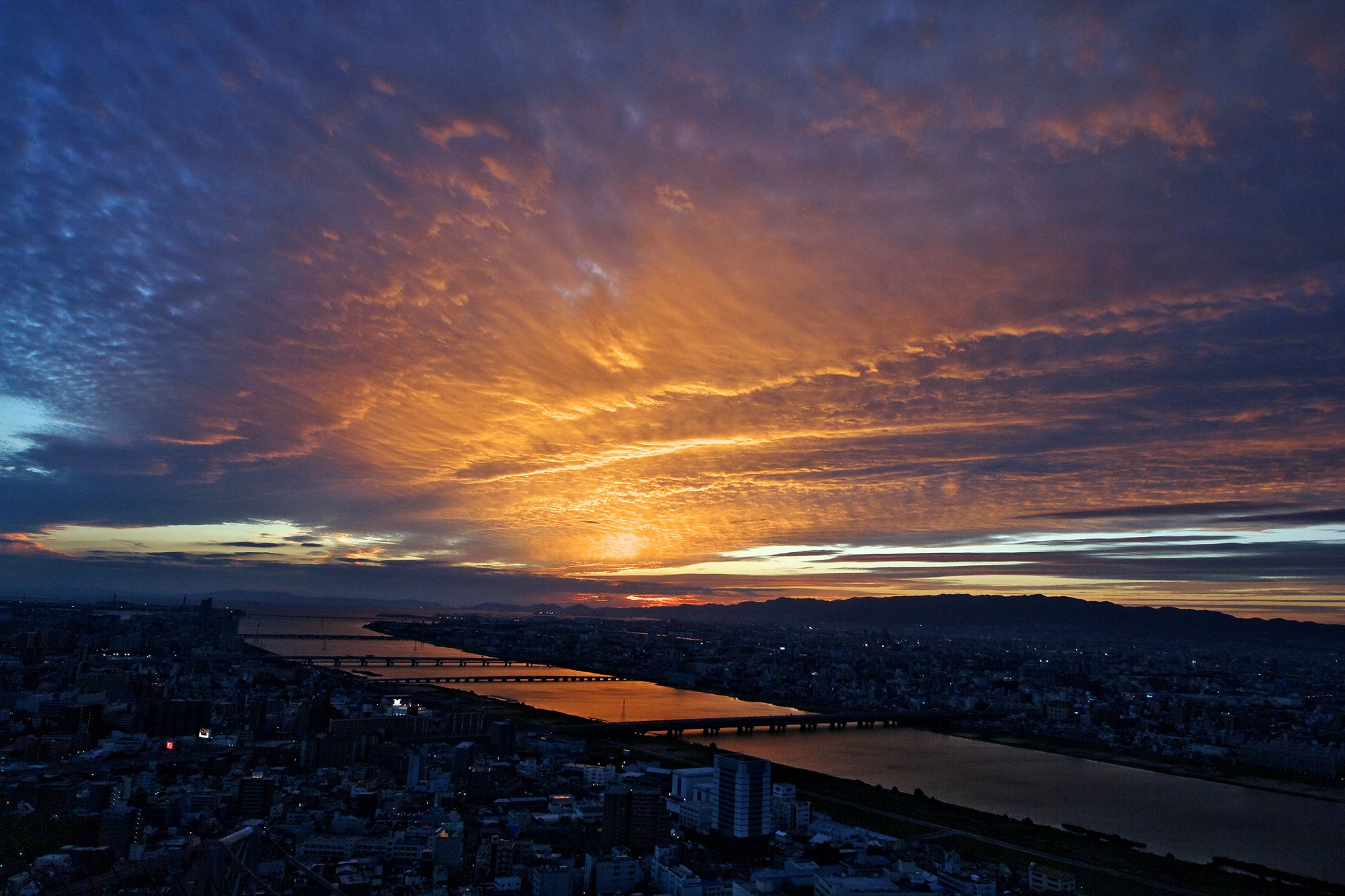梅田スカイビル「空中庭園展望台」では、屋上の展望フロアから、年に2回、2月と10月の限られた数日間のみ、明石海峡大橋の中央に夕陽が沈む幻想的な光景をご覧いただけます。