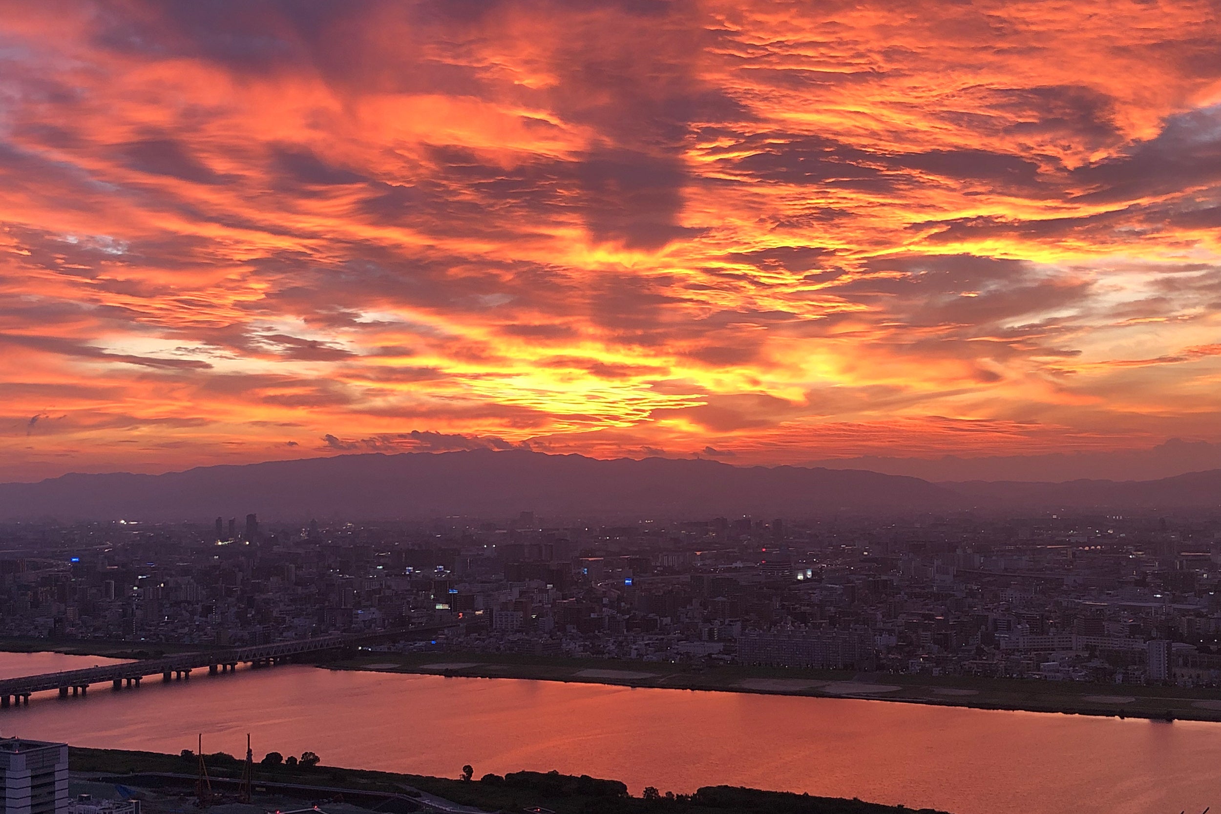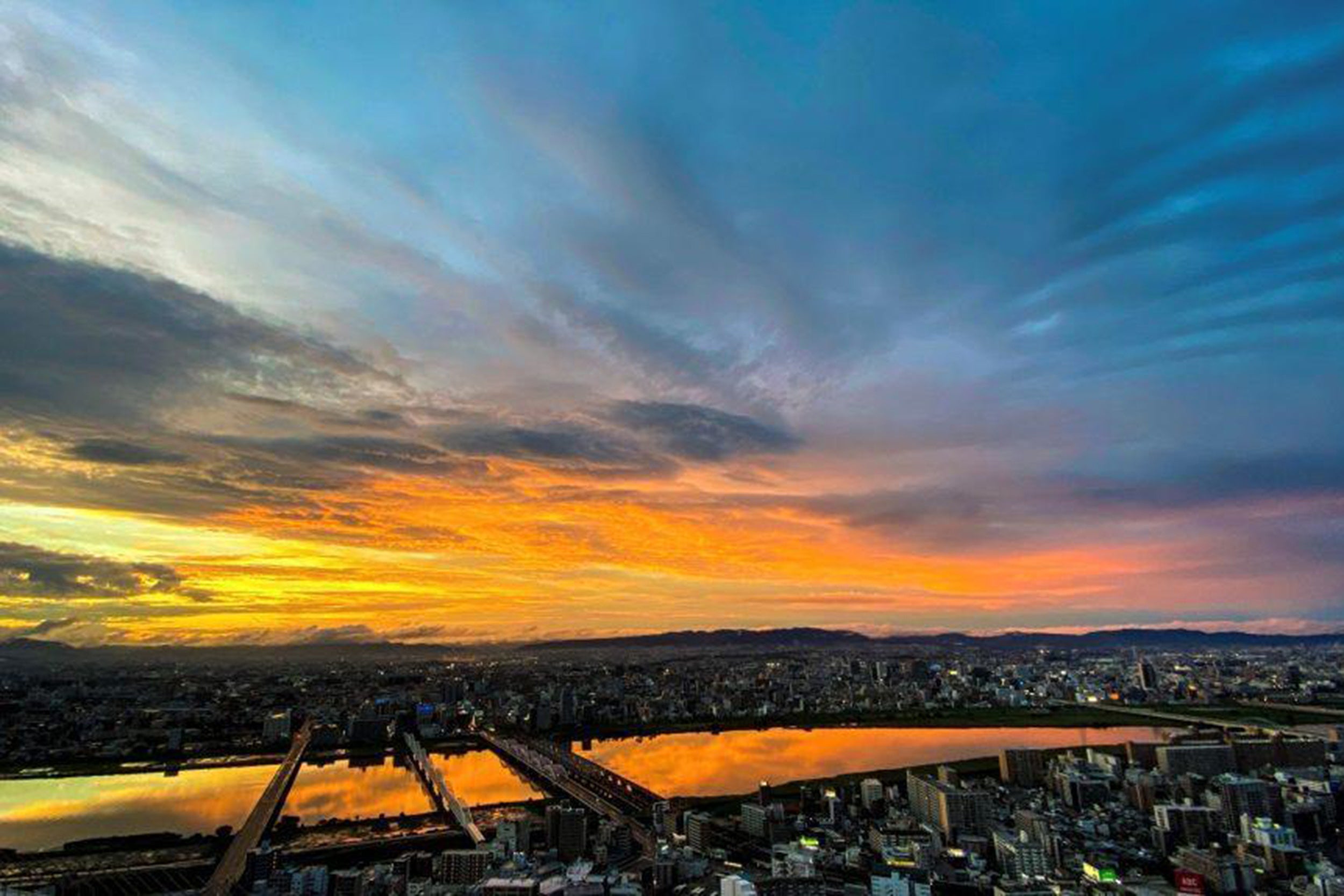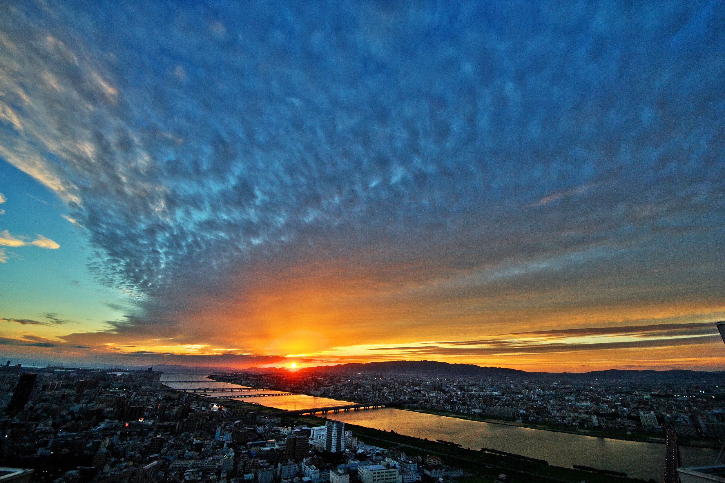 梅田スカイビル「空中庭園展望台」では、屋上の展望フロアから、年に2回、2月と10月の限られた数日間のみ、明石海峡大橋の中央に夕陽が沈む幻想的な光景をご覧いただけます。