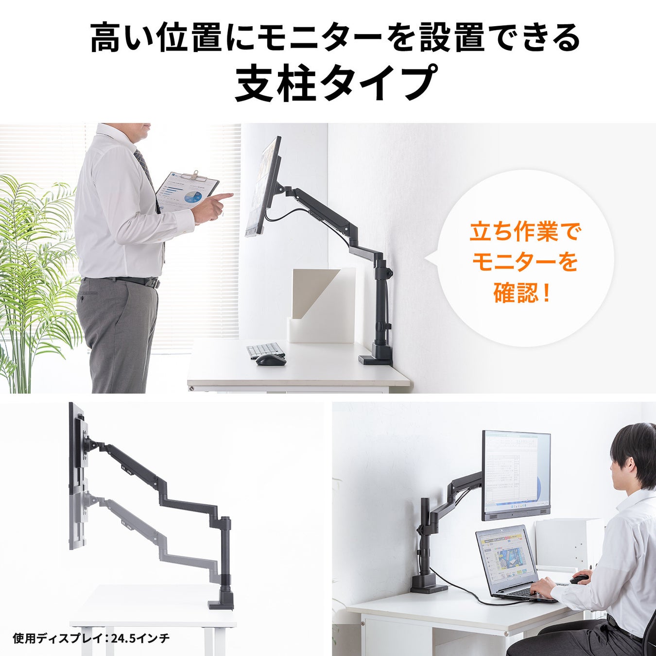 立ち作業でモニターを確認したり、ノートPCやモニターとの上下での設置のような使い方にも便利です。
