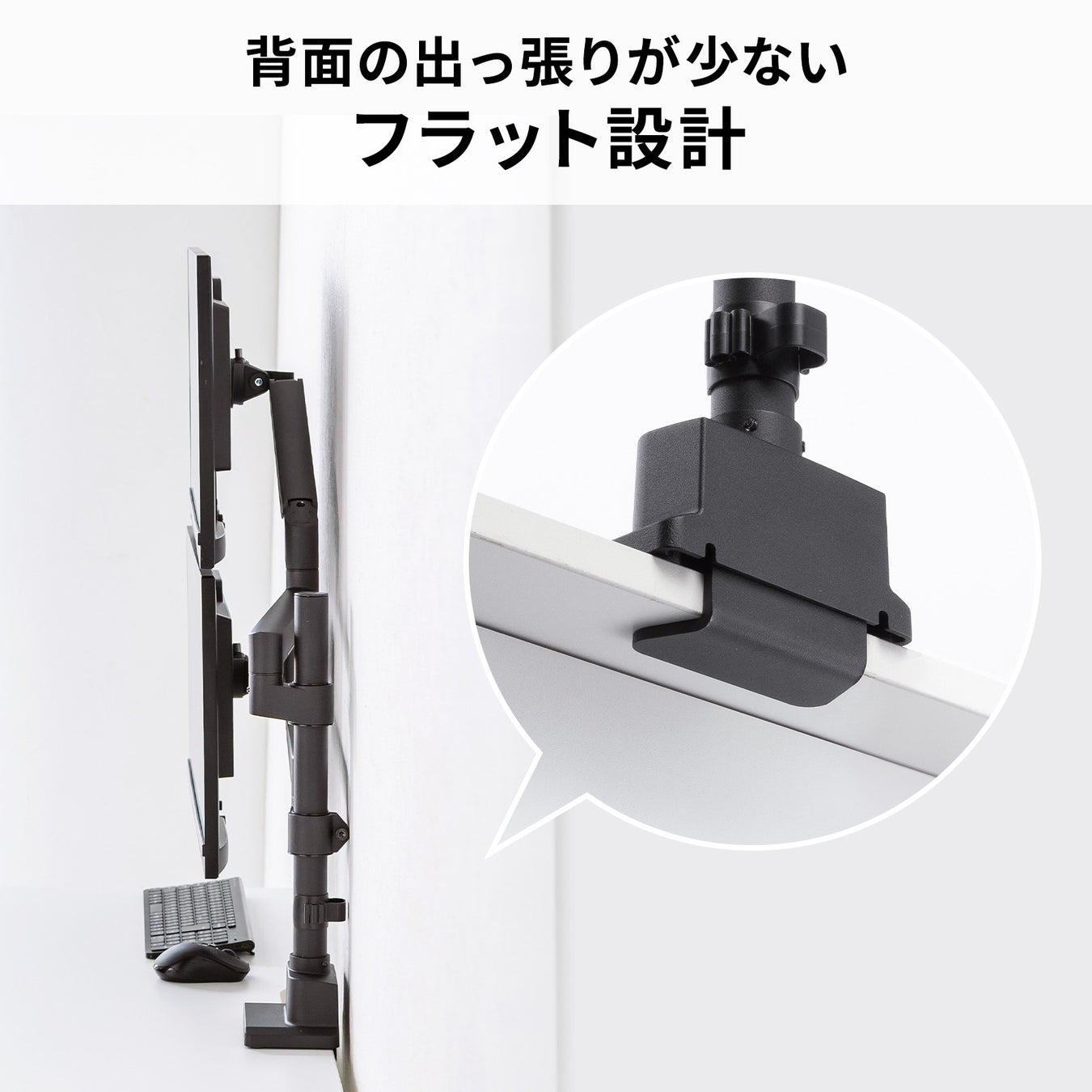 薄く、短いクランプで様々なデスクに設置できる!