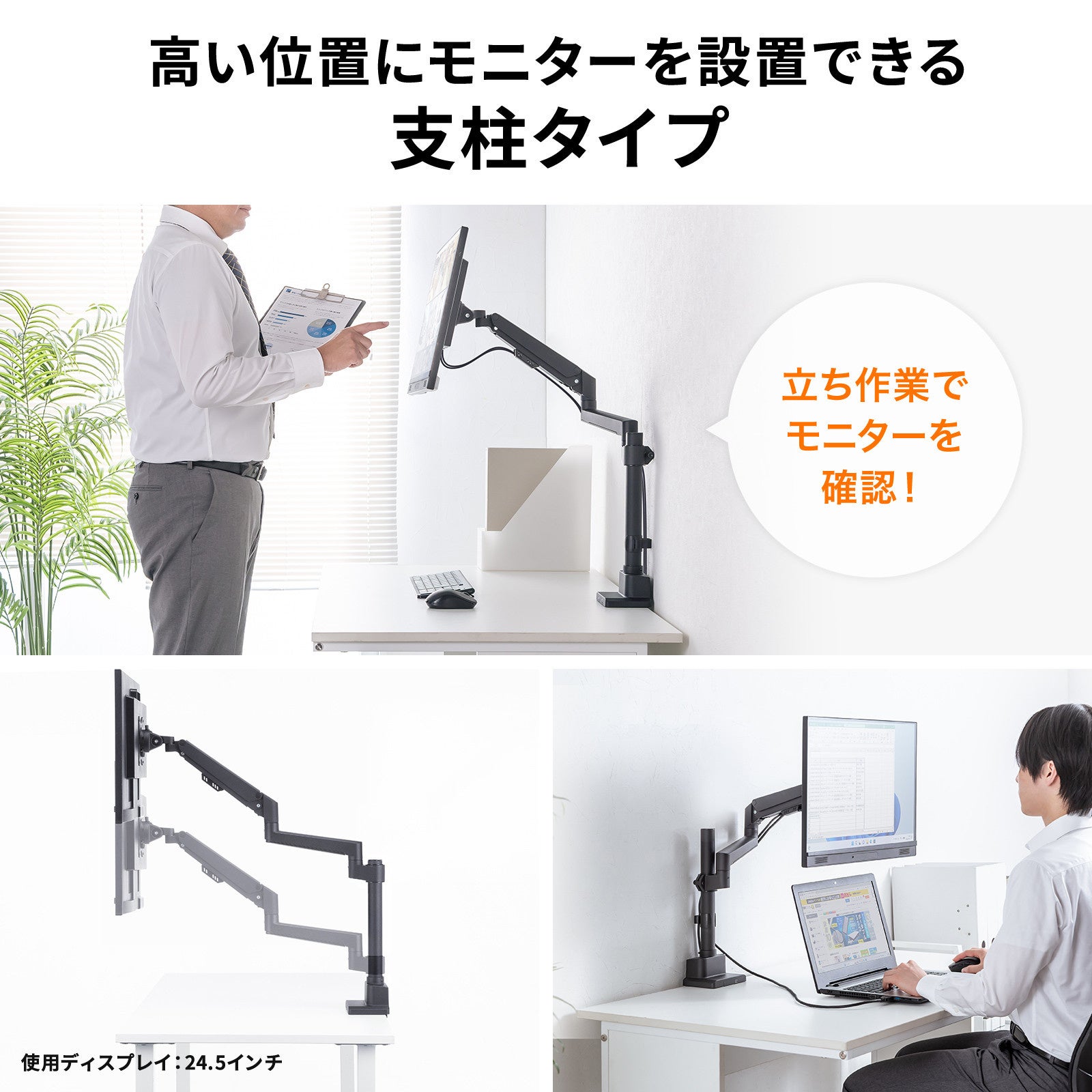 立ち作業でモニターを確認したり、ノートPCやモニターとの上下での設置のような使い方にも便利です。