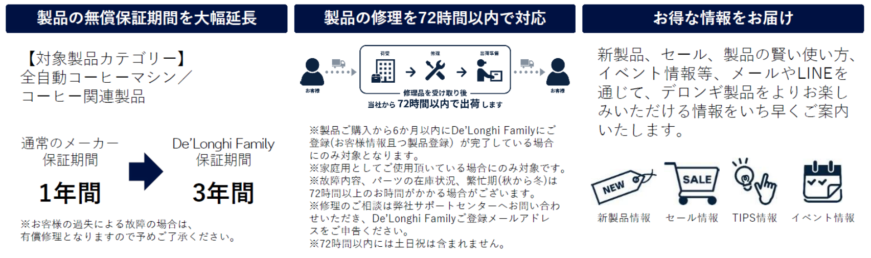 デロンギ製品をご購入いただいたお客様に、安心して製品を長くご愛用いただくため、ご購入後のメーカー無償保証期間の延長、万が一の際の迅速な修理対応といったアフターケアを大幅に拡大し提供いたします。また、メンバー限定の先行情報として、新商品やセールなどの最新情報もいち早くお届けいたします。
