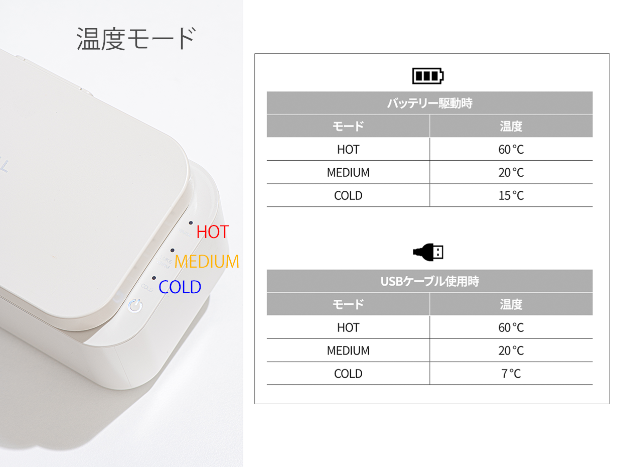 温めるHOT(温め)モード、冷たい状態を維持するMEDIUM(保冷)モード、冷却するCOLD(冷却)モードが備わっています。