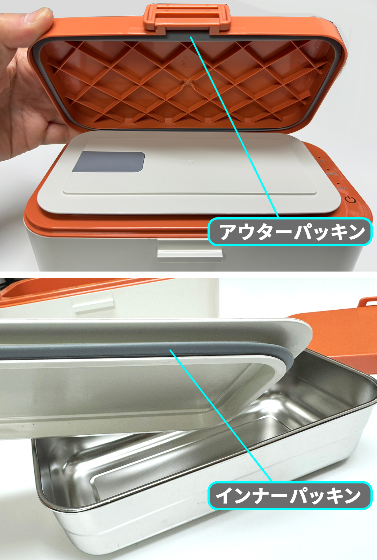 食品を入れるインナーボックス、蓋、パッキン等はすべて食品専用に作られ、素材から有害物質が無い事が証明されています。