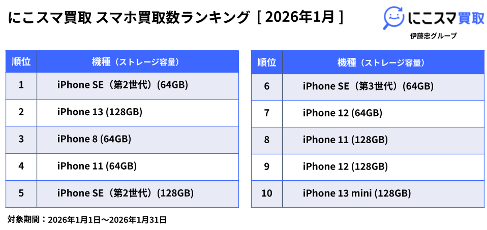 中古スマートフォンの個人向け販売・買取サービス「にこスマ」を運営する株式会社Belong(本社:東京都港区、代表取締役社長:西村 耕一郎 以下、「Belong」)は、「にこスマ」における2026年1月の中古スマホ/機種別販売数・買取数ランキングを発表します。